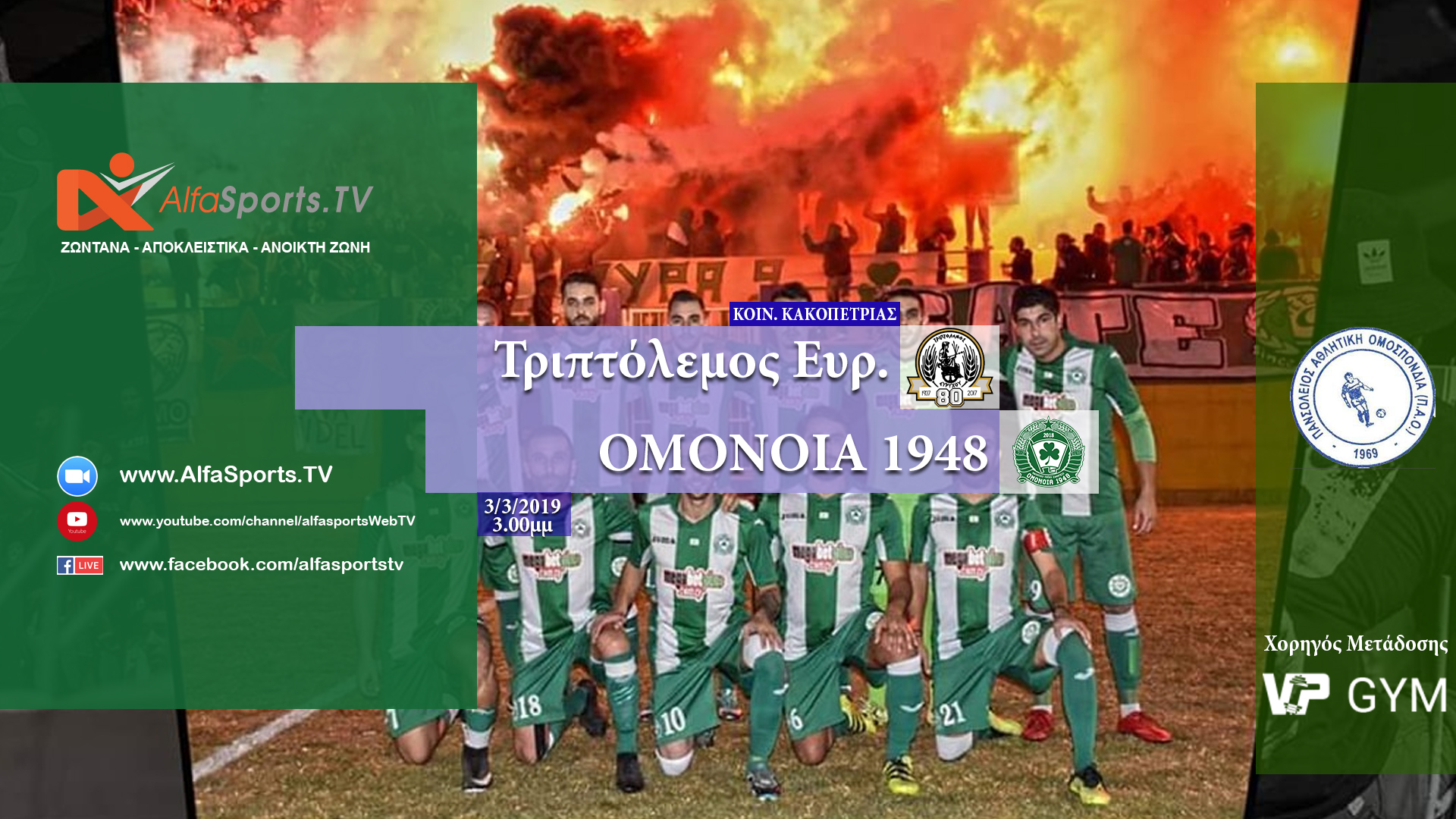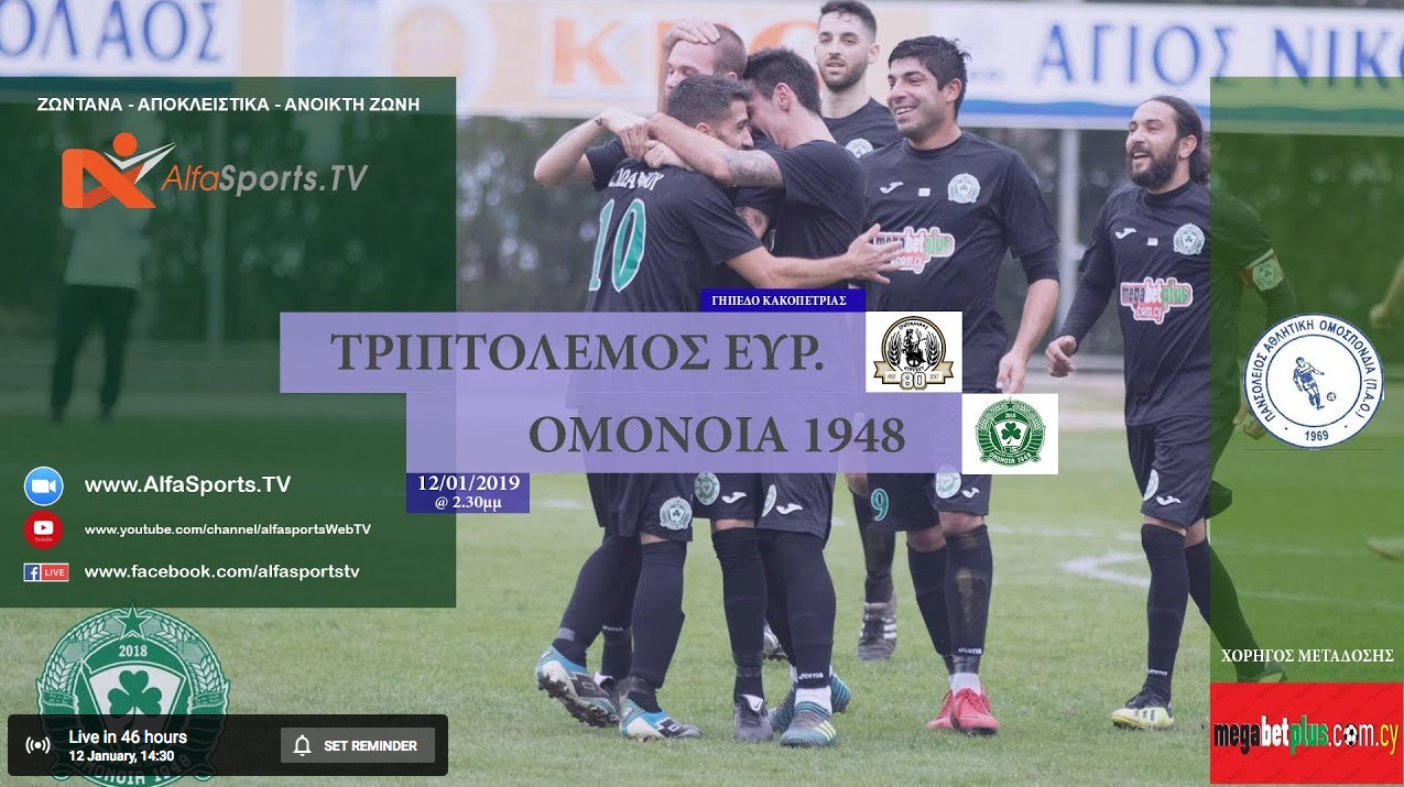 Σάββατο 9 Μαρτίου, η ώρα 3.00μμ, η ΟΜΟΝΟΙΑ 1948 υποδέχεται στο γήπεδο Παλιομετόχου τον Τριπτολεμο Ευρύχου στον επεναληπτικό αγώνα του.