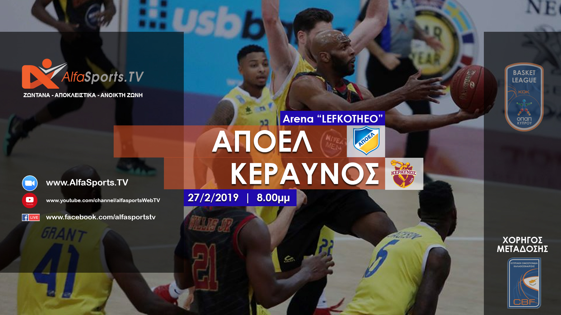 Η τηλεόραση του Alfasports φέρνει κοντά σας τον σημαντικό αγώνα ΑΠΟΕΛ – ΚΕΡΑΥΝΟΣ για την OPAP Basket League. Τετάρτη 28/2 στις 8μμ, ζωντανά από.
