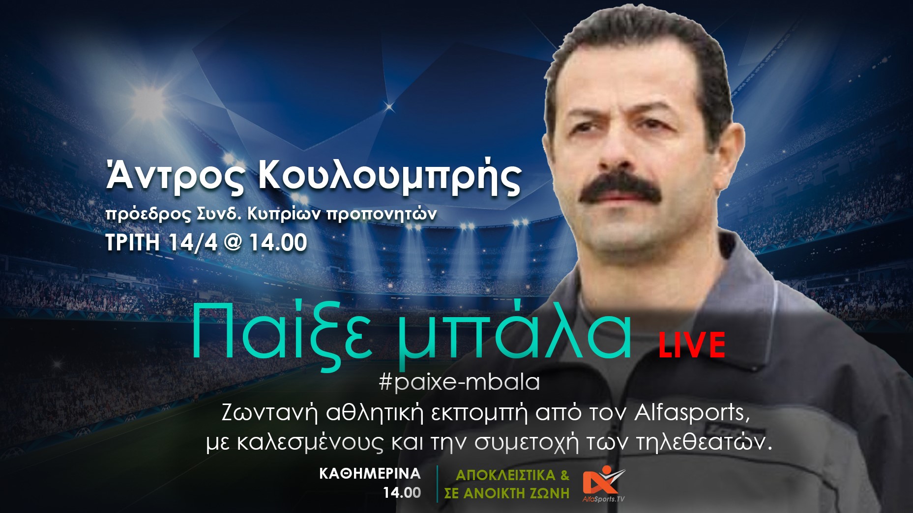 Μην χάσετε αυτήν την Τρίτη14/04/2020 και η ώρα 14:00 την ζωντανή αθλητική εκπομπή του Alfasports.TV “ΠΑΙΞΕ ΜΠΑΛΑ”, με καλεσμένο τον.