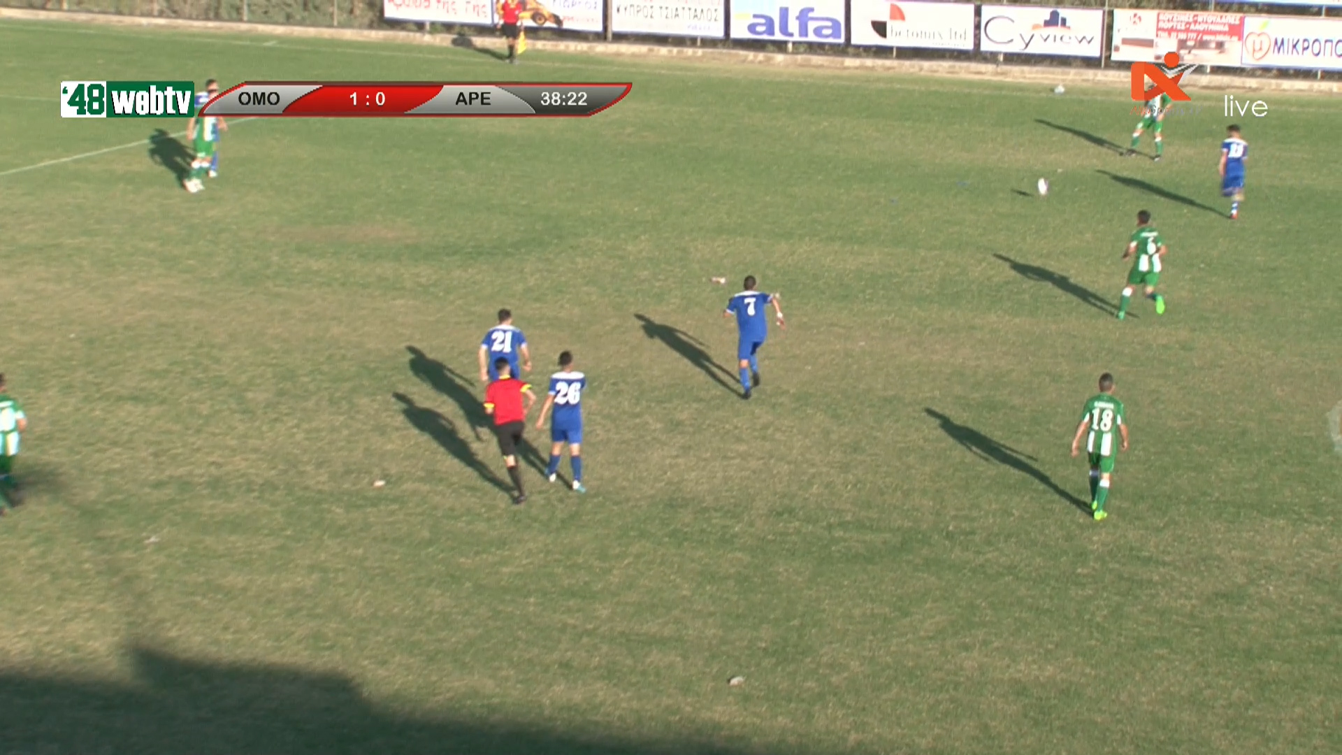 Μεγάλης βαθμολογικής σημασίας νίκη για την ΟΜΟΝΟΙΑ 1948 με 1-0 κόντρα στην ΑΠΕΑ Ακρωτηρίου. Με αυτήν την νίκη η ΟΜΟΝΟΙΑ ανέβηκε στην δεύτερη θέση με 16 βαθμούς με 1 βαθμό διαφορά απο τον Εθνικό Λατσιών, Ορφέα Λευκωσίας και Κόρνο FC. Πρώτη στον βαθμολογικό πίνακα είναι η ΑΠΕΠ Πιτσιλιάς με 20 βαθμούς. Παρακολουθήστε τα καλύτερα στιγμιότυπα της αναμέτρησης μέσα απο την κάμερα του ALFASPORTS TV.