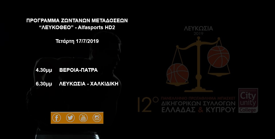 Η διαδικτυακή αθλητική τηλεόραση του Alfasports TV φέρνει κοντά σας σε αποκλειστικές μεταδόσεις και σε ανοικτή ζώνη το 12ο Πανελλήνιο πρωτάθληματο μπάσκετ δικηγορικών συλλόγων, το οποίο θα διεξαχθεί στη Λευκωσία από τις 16-21/7/2019. Δείτε όλες τις αναμετρήσεις από τον AlfasportsHD 1,2 και 3 σε ταυτόχρονες μεταδόσεις!