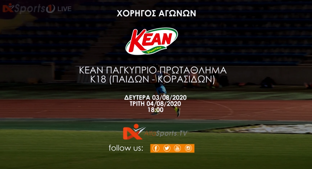 Συνέχεια στις μεταδόσεις στίβου με το ΚΕΑΝ Παγκύπριο Πρωτάθλημα Κ18 Παίδων – Κορασίδων. Παρακολουθήστε τους αγώνες ζωντανά, αποκλειστικά και σε ανοικτή ζώνη την Δευτέρα 03/08/2020 και Τρίτη 04/08/2020 η ώρα 18:00 απευθείας απο το Γ.Σ.Π. Ο αγώνας είναι μία χορηγία της εταιρείας ΚΕΑΝ